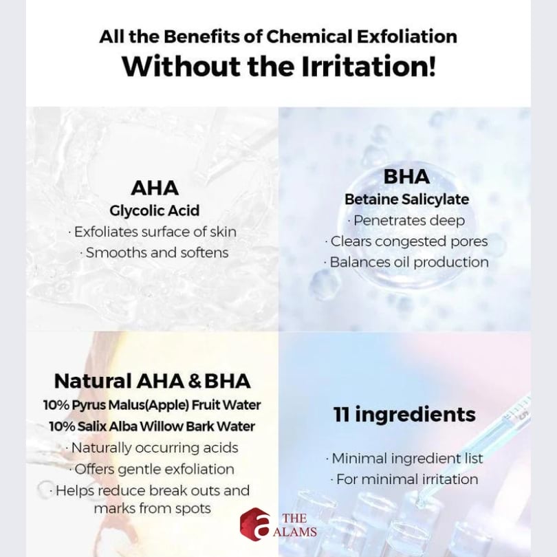Water, Salix Alba (Willow) Bark Water, Pyrus Malus (Apple) Fruit Water, Butylene Glycol, 1,2-Hexanediol, Sodium Lactate, Glycolic Acid, Betaine Salicylate, Allantoin, Panthenol, Ethyl Hexanediol.