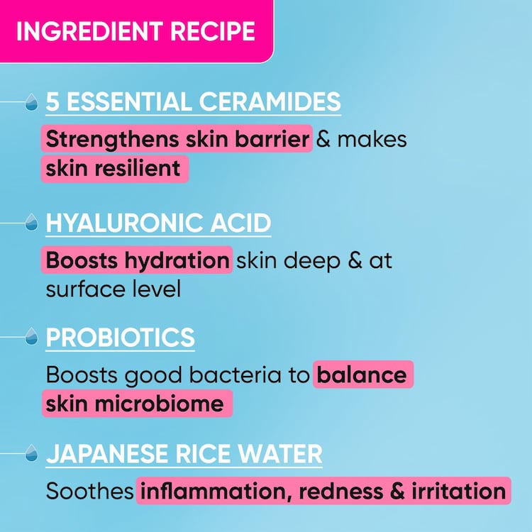 Aqua, Cocamidopropyl Betaine, Glycerine, Decyl Glucoside, Disodium Cocoyl Glutamate, Triethanolamine, Panthenol, Laminaria Digitata Extract (and) Cetyl – PG Hydroxyethyl Palmitamide (and) Ceramide 1 (and) Ceramide 2 (and) Ceramide 3 (and) Ceramide 4 (and) Ceramide 6 II, Sodium hyaluronate, Oryza Sativa (Rice) Bran Water, Lactobacillus (and) Maltodextrin, Cocos Nucifera (Coconut) Oil, Simmondsia Chinensis (Jojoba) Seed Oil, PEG-40 Hydrogenated Castor Oil, Citric Acid, Tocopheryl Acetate, Acrylates/C10-30 Alkyl Acrylate Crosspolymer, Xanthan Gum, Disodium EDTA, IFRA Certified Allergen Free Fragrance, Benzyl Alcohol (and) Ethylhexylglycerin (and) Tocopherol.