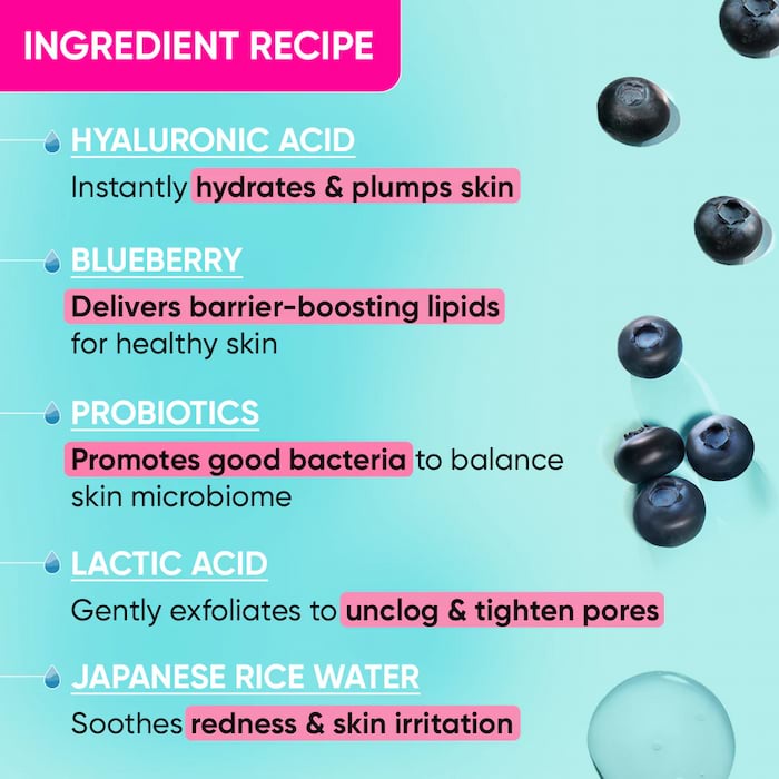 Aqua, Lactic Acid, Propanediol, Sodium Hydroxide, Glycerin, PEG-40 Hydrogenated Castor Oil, Hydroxyethylcellulose, Silanetriol, Hyaluronic Acid, PPG-26-Buteth-26, PEG-40 Hydrogenated Castor Oil, Water, Polysorbate 20, Mentha Piperita (Peppermint) Oil, Allantoin, Lactobacillus, Maltodextrin, Saccharomyces/Xylinum/Black Tea Ferment, Laminaria Digitata Extract, Hydrogenated Lecithin, Cetyl-PG Hydroxyethyl Palmitamide, Ceramide 1,2,3,4,611, Cholesterol, 1,2-hexanediol, Aqua, Oryza Sativa (Rice) Extract, Saccharomyces ferment lysate filtrate, Citric acid, Sodium Benzoate, Potassium sorbate, Glycerin, Aqua, Vaccinium Angustifolium (Blueberry) Fruit Extract, Glycyrrhiza Glabra (Licorice) Root Extract, Phenoxyethanol, Ethylhexylglycerin.