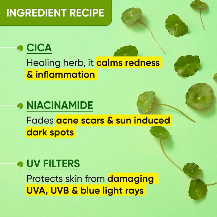 Aqua, Ethylhexyl Methoxycinnamate, Butyl Methoxydibenzoylmethane, Benzophenone-3, Phospholipids, 1,3-Butylene Glycol, Cyclopentasiloxane, Sodium Acrylates Copolymer, Lecithin, Glycerine, Niacinamide, C12-15 Alkyl Benzoate, Caprylic/Capric Triglyceride, Propylene Glycol, Propanediol, Zea Mays (Corn) Starch, Centella Asiatica (Cica) Extract, Methylene Bis-Benzotriazolyl Tetramethylbutylphenol, Aqua, Decyl Glucoside (and) Propylene Glycol, Xanthan Gum, Diethylamino Hydroxybenzoyl Hexyl Benzoate, Titanium Dioxide, Silica, Silanediol Salicylate, Sodium Hyaluronate, Aloe Barbadensis Leaf Juice, Camellia Sinensis Leaf Extract, Tocopheryl Acetate, Bisabolol, Sodium Polyacrylate, Dimethicone, Cyclopentasiloxane, Trideceth-6, PEG/PPG-18/18 Dimethicone, Polymethylsilsesquioxane, Cetearyl Alcohol, Glyceryl Monostearate,Sodium Gluconate, Disodium EDTA, Silica, Phenoxyethanol, Ethylhexylglycerin.