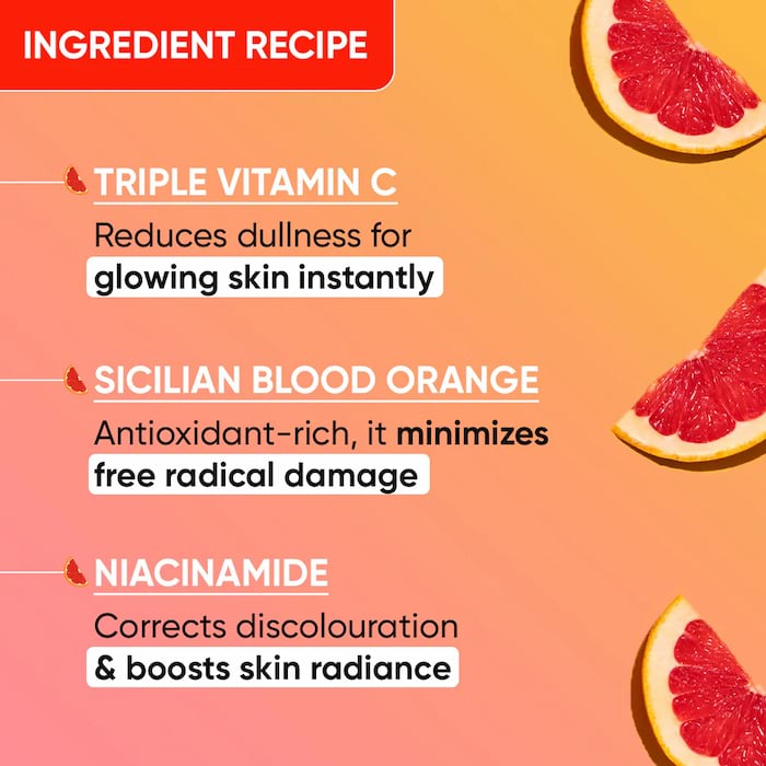 Aqua, Dimethicone, Butylene Glycol, Phenyl Trimethicone, Caprylic/Capric Triglyceride, Hydroxyethyl Acrylate/Sodium Acryloyldimethyl Taurate Copolymer, Isohexadecane, Polysorbate 60, Synthetic Fluorphlogopite, TiO2 (CI 77891), Tin Oxide (CI 77861), Cyclopentasiloxane, Cetearyl Dimethicone/Vinyl Dimethicone Crosspolymer, Cetyl Alcohol, Cetearyl Alcohol, Ceteareth 20, Glycerin, Water, Terminalia Ferdinandiana (Kakadu Plum) Fruit Extract, Citrus Sinensis (Blood Orange) Fruit Extract, Niacinamide, Ascorbyl Glucoside. Panthenol, Argania Spinosa (Argan) Kernel Oil, Tocopheryl Acetate, Hydrogenated Castor Oil, Glyceryl Stearate, PEG-100 Stearate, Talc, Titanium Dioxide, Cyclopentasiloxane, Dimethicone, Glycol Distearate, Glyceryl Stearate, Xanthan gum, Disodium EDTA, BHT, Phenoxyethanol, Ethylhexylglycerin, Fragrance.