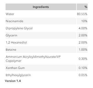 Water, Niacinamide, Dipropylene Glycol, Glycerin, 1,2-Hexanediol, Betaine, Ammonium Acryloyldimethyltaurate/VP Copolymer, Xanthan Gum, Ethylhexylglycerin.