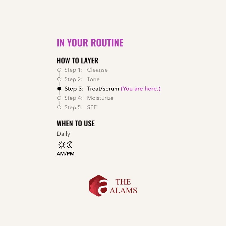 - On cleansed skin, apply 2-3 drops and tap onto to the face and neck.