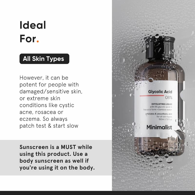 - Avoid using Benzoyl Peroxide, retinol, other AHAs/BHAs (chemical exfoliants) & physical exfoliants at the same time as glycolic acid.