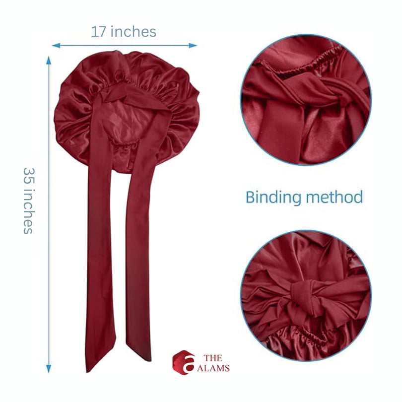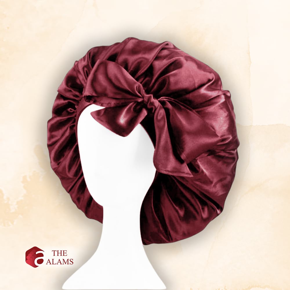 - Place the satin hair bonnet over your head, ensuring that all of your hair is contained inside the bonnet.