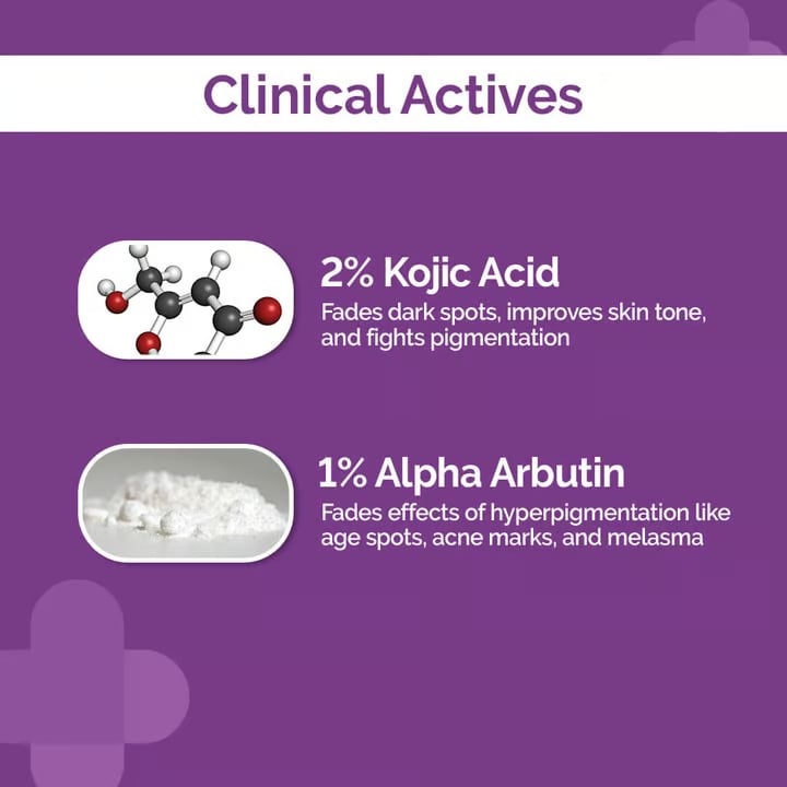 Purified Water, Kojic Acid, Niacinamide, Propandiol, Propylene Glycol, Alpha Arbutin, Curcuma Longa (Turmeric) Root Extract, Phenoxyethanol, Chrysanthemum Indicum Flower Extract, Rosmarinus Officinalls Extract, Sodium Hyaluronate, Ethylhexylglycerin, Sodium PCA, Sodium Metabisulphite, Glycerin, Hamamelis Virginiana (Witch Hazel) Extract, Magnolia Kobus Flower Extract, Panthenol, Polygonum Cuspidatum Root Extract & Hydroxyproline, Proline.